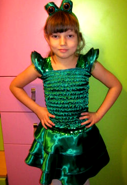 Красивый атласный карнавальный костюм Лягушки, Жабки для девочки худой комплекции. В комплекте с пышной юбкой, комбинация фатина и атласа, кофточка, обруч украшен паетками. На рост 98-116 см, 3-6 лет. Отличный образ для любого мероприятия!