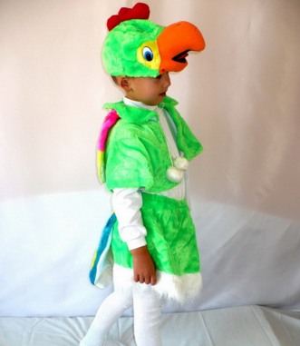 Яркий меховой карнавальный костюм Попугай для девочки. В комплекте юбка с забавных хвостиком, накидка и голова. На рост 98-122 см. Возможен прокат аналогичного костюма для мальчика, вместо юбки в комплекте зеленые бриджи из атласа.