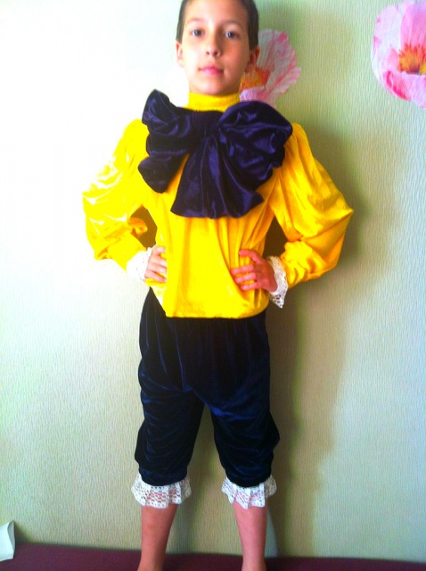 Шикарный бархатный карнавальный костюм Кот Леопольд для мальчика на рост 116-134 см. В клмплекте блузон, бант, штаны. Сзади натуральный хвост. Расшит кружевом. Бант сьемный.