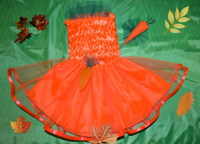 Карнавальный костюм Морковки детский из фатина и атласа. В комплекте фатиновая юбка, топ, украшение с морковкой на голову. На рост 92-116 см, 3-6 лет.