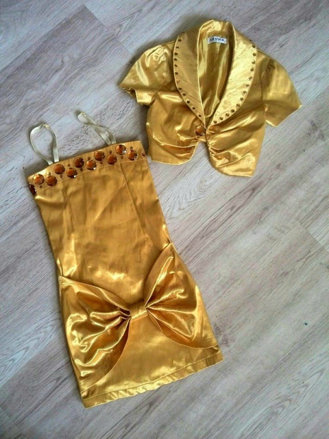 Золотое элегантное коктейльное платье для девочки. Комплект с болеро. Шикарный комплект для тех, кто не любит пышных и помпезных платьев. Разшит камнями. Смотрится сногсшибательно. На рост 122-140 см.Длина платье 57 и шлейки 12 см и можно отрегулировать. Пог 29 см. Болеро длина 36 пог 31-32 плечо 11 смПодойдет для любых мероприятий. Залог 400 грн.