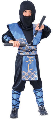 Карнавальный костюм Ниндзя Самурай детский 6 в 1. Синего цвета. В комплекте наколенники, нарукавники, штаны, кофточка, накидка и балаклава. На 7-9 лет, рост 122-134 см.