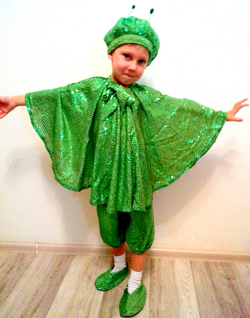 Блестящий карнавальный костюм Светлячка Жучка Кузнечика на рост 104-122 см. Универсальный 3-7 лет. Накидка, бриджи, берет и чешки (идут на размер 29-30). Блестящий яркий костюм для отличного праздника!