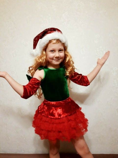 Шикарный пышный и яркий карнавальный костюм Эльф девочка, Помощница Санты или Рождественский цветок Омела. В комплекте юбка из фатина и бархата, кофточка, митенки, колпак. Идет на рост 98-122 см, 3-6 лет.