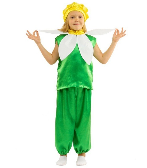 Маскарадный атласный карнавальный костюм Цветка Нарцисса, Эдельвейса или Подснежника для мальчика. Для детей возрастом от 4 до 7 лет. Рост 110-122. В костюм входит: кофта, штаны, шапочка и воротник с лепестками. Отличный вариант для любого мероприятия!