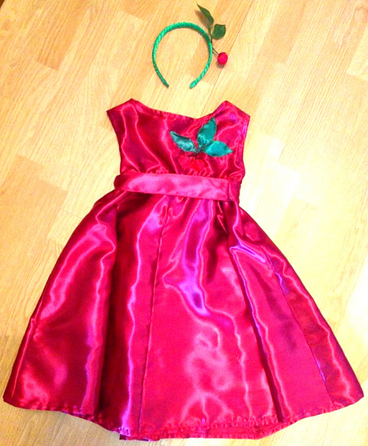 Отличный карнавальный костюм Вишня, Черешня детский на рост 116-134 см. На 4-7 лет. В комплекте атласное платье, обруч. Есть возможность дополнить образ подюбником для большей пышности.