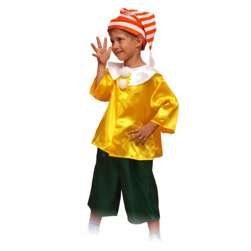Детский карнавальный костюм Буратино для мальчика атласный. На рост 134-150 см или полному мальчику ростом ниже. В комплекте шапка колпак, туника блузон, шортики.