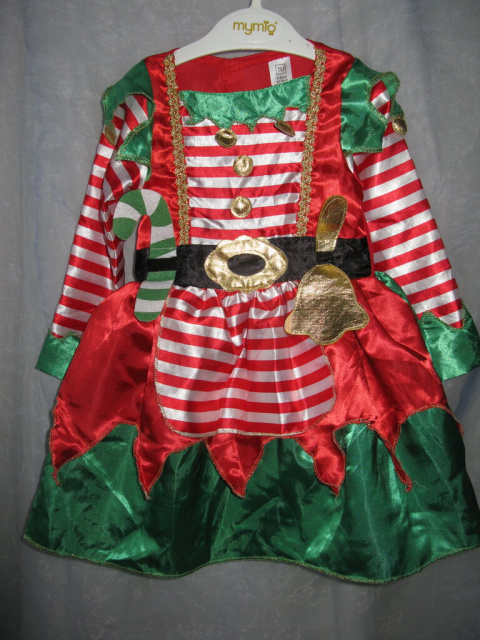 Нарядный детский карнавальный костюм Помощница Санты, Эльфа, Мисс Санты для девочки 1-3 года, рост 80-98 см. Платье из атласа, в комплекте с красным колпаком.
